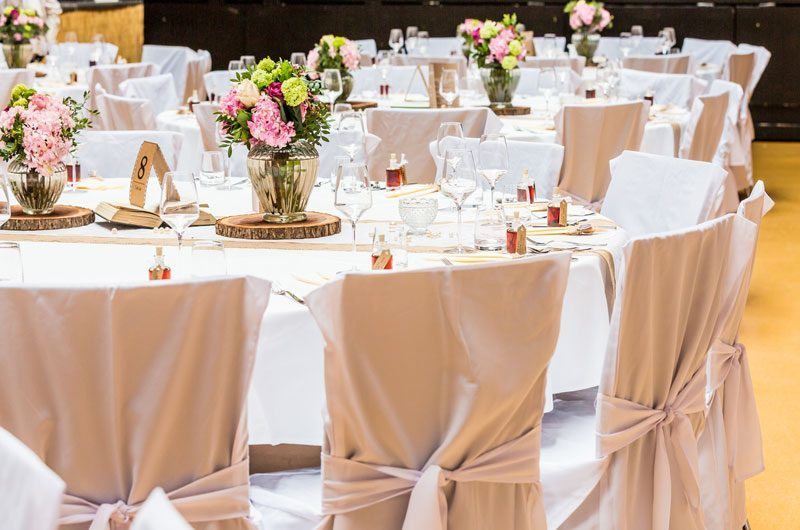 Es ist üblich, dass während des Hochzeitsessens eine Hintergrundmusik spielt. Hier ist nicht nur die Auswahl der Musik, sondern auch die Lautstärke wichtig: Ihre Gäste möchten sich natürlich während des Essens unterhalten können, weshalb eine dezente musikalische Untermalung angebracht ist. Sie erzeugt ein angenehmes Ambiente und dämpft gleichzeitig das Klappern von Geschirr und Besteck. Die Musikauswahl sollte zur Location und natürlich zu den Gästen passen. Meistens sind mehrere Generationen anwesend, weshalb man mit klassischer Musik oder Evergreens nichts falsch machen kann. Ob CD oder Livemusik: gegen Ende des Festmahls darf sie allmählich lauter werden und Lust aufs Tanzen machen. Jedoch passt Tanzmusik nicht als Tafelmusik.